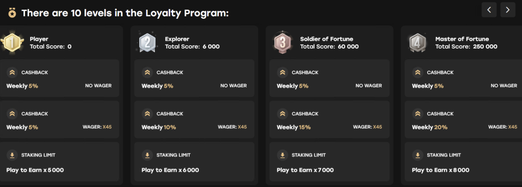 - Tasot 8-10 (VIP Steel – Platinum): Eliittitasot, jotka tarjoavat korkeimmat staking-kertoimet ja päivittäiset käteispalkinnot.